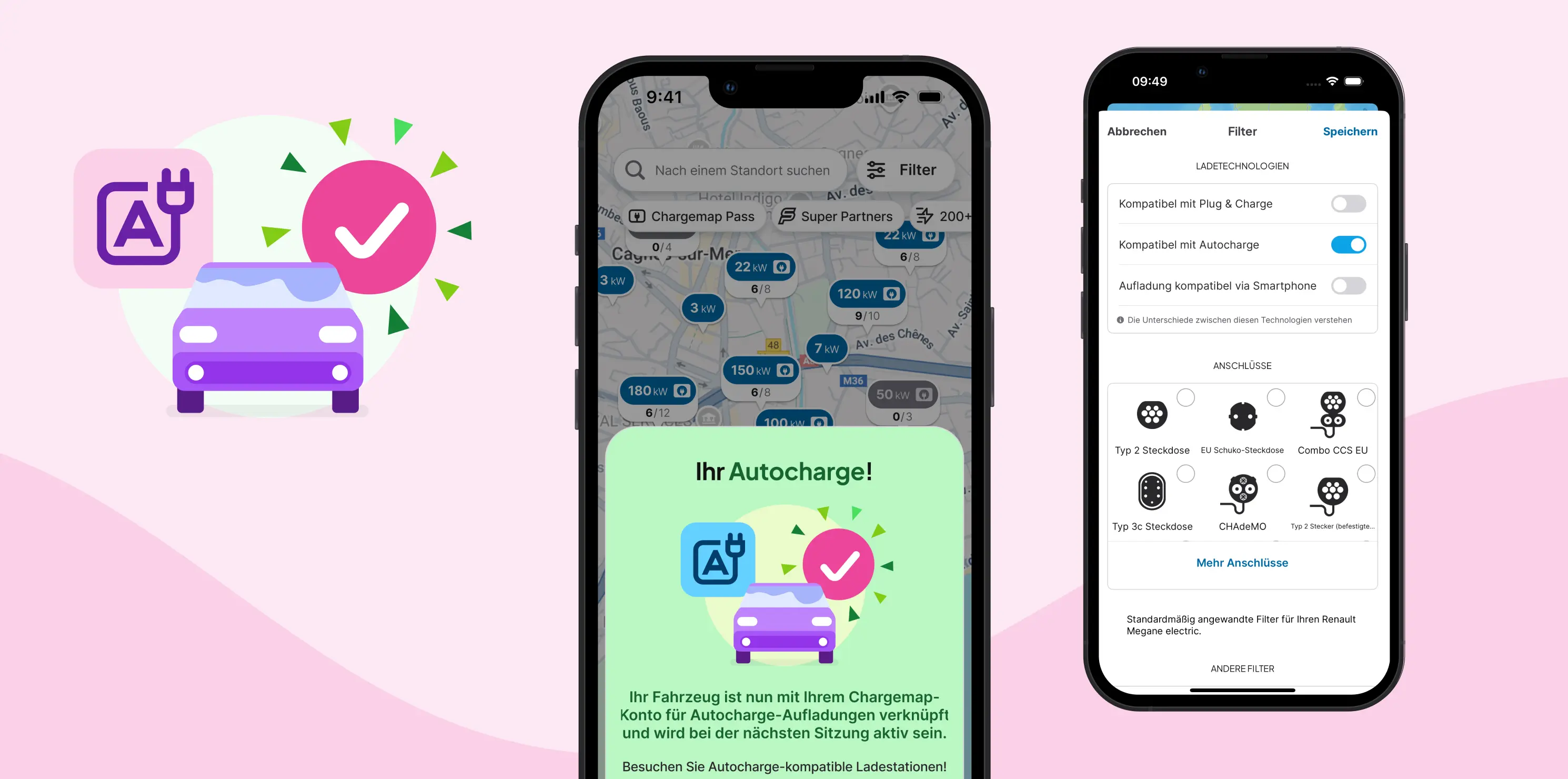 - Unterstützen Ihr Fahrzeug und die Ladesäule Autocharge, so kann der Ladevorgang automatisch starten, sobald Sie Ihr Auto anschließen – ganz ohne Ladekarte oder Smartphone. Voraussetzung für die Aktivierung ist ein erster Ladevorgang mit Ihrem physischen Chargemap Pass.