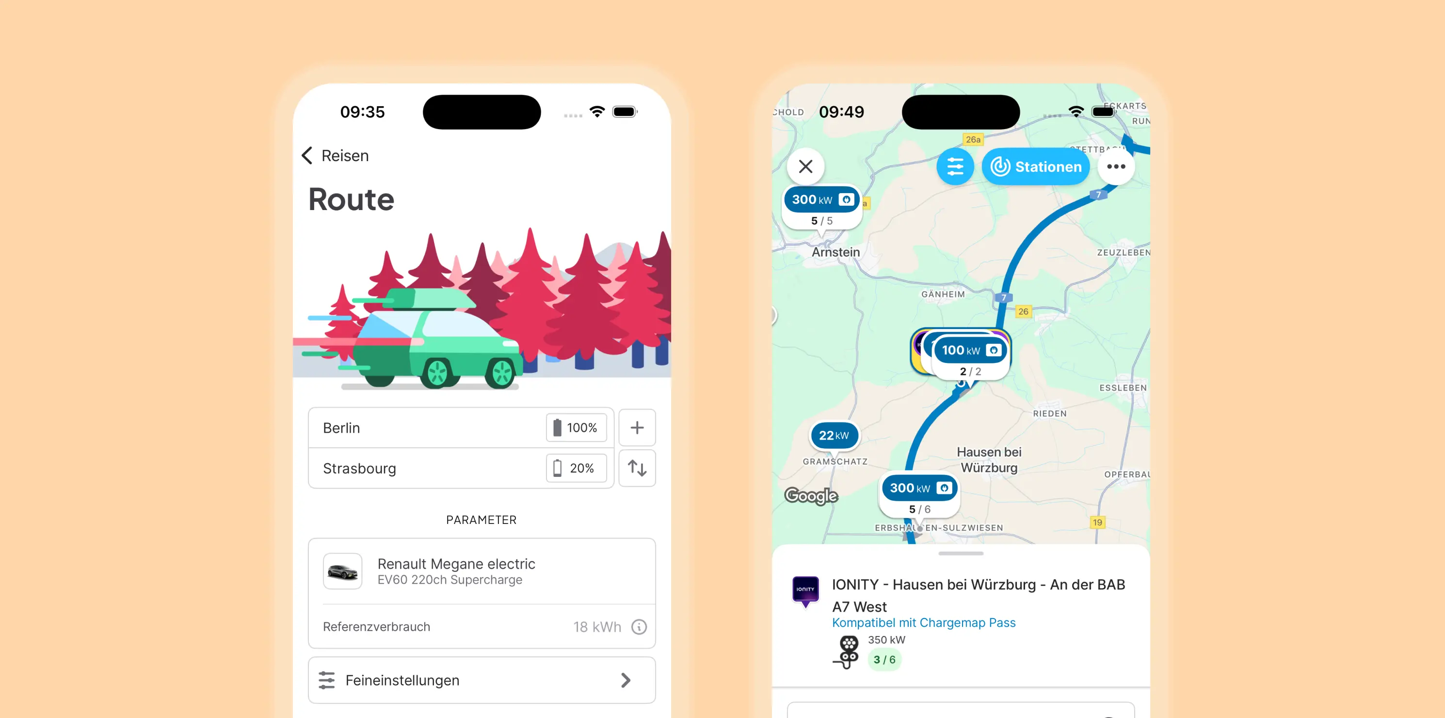 - Ihre Ladestopps individuell anpassen, indem Sie die Ladesäulen nach Leistung, Steckertyp oder Nutzerbewertungen filtern,